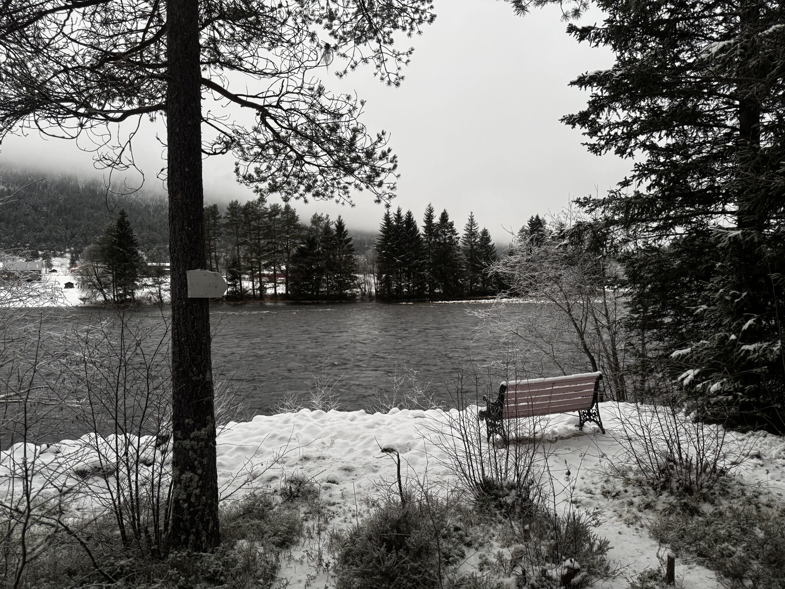 冬の川の前にベンチがあって、